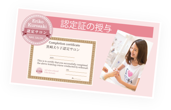 すべての受講と黒崎えり子講師が定めた技術・接客項目の基準を満たした方には、「黒崎えり子認定サロン」として認定証を発行いたします。